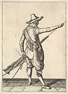 A soldier pulling out the ramrod from its holder, from the Musketeers series, plate 25, in Wapenhandelinghe van Roers Musquetten Ende Spiessen (The Exercise of Arms)