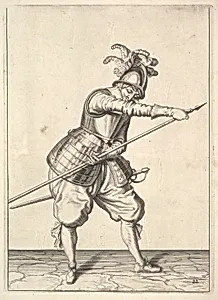A soldier sliding his right hand along the training-pike, from the Lansquenets series, plate 22, in Wapenhandelinghe van Roers Musquetten Ende Spiessen (The Exercise of Arms)