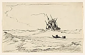 A Storm at Sea with a Large Ship and a Small Boat with Two Figures