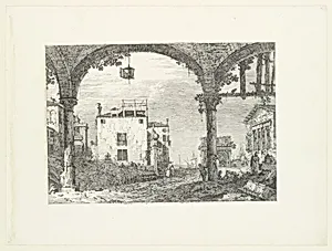 A three-arched portico with an open lantern hanging at center, a triumphal arch and ruins of a classical temple in the background, from 'Views' (Vedute altre prese da i luoghi altre ideate da Antonio Canal)