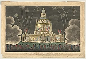 A View of the Temple of Concord Erected in the Green Park, to Celebrate the Glorious Peace of 1814, Exhibiting the Fireworks on the 1st of August by Robert Laurie|James Whittle