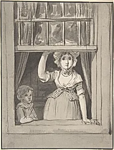 In the intimate drawing *A Woman Standing at an Sash Window, a Small Boy Beside Her* (ca. early 19th century), Dutch artist Anthonie Andri captures a tender moment of everyday life. Created during his active years (1761–3), the work depicts a woman poised at a sash window—its sliding panels a hallmark of Northern European architecture—gazing outward while a small boy stands attentively by her side. This quiet domestic scene evokes the warmth of family bonds, a common theme in 18th- and early 19th-century genre art. Executed in brush and gray ink with a framing line in pen and black ink, the m...
