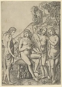 Marcantonio Raimondi (c. 1480–1534), born near Bologna, Italy, emerged as one of the Renaissance's premier engravers, revolutionizing printmaking through his mastery of reproductive techniques. He trained in the workshop of the goldsmith, painter, and niellist Francesco Francia, whose influence is evident in his early engravings, such as the goldsmith-like shading in *Pyramus and Thisbe* (1505), h...