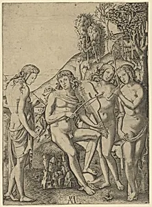 Marcantonio Raimondi (c. 1480–1534), born near Bologna, Italy, emerged as one of the Renaissance's premier engravers, revolutionizing printmaking through his mastery of reproductive techniques. He trained in the workshop of the goldsmith, painter, and niellist Francesco Francia, whose influence is evident in his early engravings, such as the goldsmith-like shading in *Pyramus and Thisbe* (1505), h...