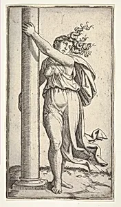 A young woman personifying Force or Strength holding a column by Marcantonio Raimondi