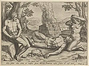 In this poignant engraving, *Adam and Eve Mourning the Death of Abel* (plate3 from *The Story of Cain and Abel*), Flemish artist Michiel Coxie I a moment of profound biblical grief. Created in 1576, the image depicts the first parents lamenting the murder of their son Abel at the hands of his brother Cain, drawing from the Book of Genesis. Coxie, a Mannerist painter influenced by Raphael and active in Antwerp, likely designed the composition, while master engraver Johann Sadeler I brought it to life with intricate line work. As part of a narrative series, it reflects the era's fascination with...