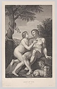 Adam and Eve, seated on a rock, with a serpent coiled around a tree at left and a lion and a lamb at right