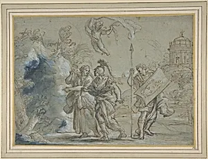 Step into the dramatic underworld of classical mythology with Giovanni Francesco Romanelli's *Aeneas and the Cuman Sibyl Entering thenal Regions* (c. 1610–1662). This intricate drawing captures the Trojan hero Aeneas, armed with shield and spear, guided by prophetic Cumaean Sibyl as they descend into Hades.elli, a prominent Italian Baroque artist known for his work in the Vatican and papal commissions, masterfully renders this pivotal moment from Virgil's *Aeneid*, blending classical antiquity with 17th-century dynamism. The scene draws from Book VI of the *Aeneid*, where Aeneas seeks his fat...