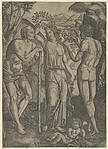 An allegorical scene; a young woman at centre holding a wreath above her head, at left is a old man leaning on a stick, a younger man at right who holds a small dragon