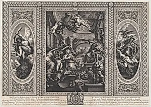 An allegorical scene showing the benefits of James' reign at center, Wise Government trampling Rebellion at right, and Liberty trampling Avarice at left