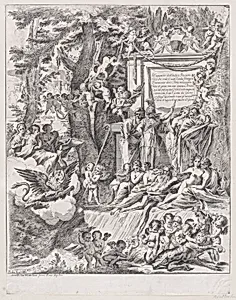 Welcome to the Metropolitan Museum of's Drawings and Prints collection, where *An Allegory in Honor of the of Cardinal Franciotti Bishop of Lucca* (ca. 1680–1700) captures a moment of ecclesiastical pomp and celebration. This etching, measuring 15 3/16 x 11 3/4 inches, was designed by the Italian Baroque artist Pietro Test (1611–1650), renowned for his intricate allegorical compositions blending classical mythology with religious themes. It was masterfully executed by Flemish engraver Arnold van Wester, who specialized in reproductive prints, bridging Testa's vision with late 17th-century tech...