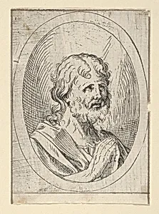 An apostle raising his eyes in prayer, in an oval frame, from "Christ, the Virgin, and Thirteen Apostles"