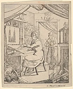 Step into the intimate world of *An Architect in His Studio*, a charming 19th-century German lithograph (ca. 1790–1850) now housed in the Metropolitan Museum of Art's and Prints department. Created anonymously and published by the Düsseldorf firm Arnz & Co., this small-scale print (6 15/16 × 5 11/16 in.) captures a male architect at work amid the clutter of his studio—think drafting tools, papers, and architectural models evoking the era's burgeoning professional class. Lithography, a revolutionary technique invented just decades earlier, allowed for precise reproduction of detailed images li...
