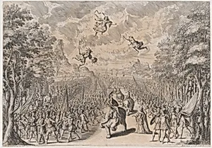 An army marching through a field; soldiers on foot at left and right, while others ride elephants and camels down the center; set design from 'La Monarchia Latina Trionfante'