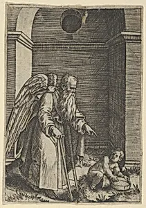 An elderly winged man with a long beard walking with crutches, possibly representing Time gesturing towards a young child holding a sieve