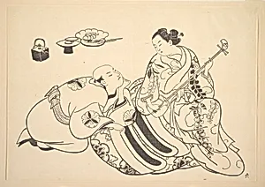 An Oiran Playing the Shamisen to a Young Man Kneeling by Her Side in Rapt Attention