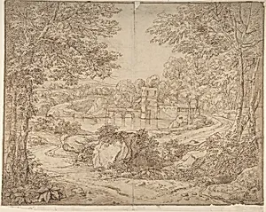 Ancient buildings next to water in the woods (recto); A variation of the same landscape in reverse (verso)