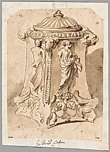 Pen and brown ink and brush and brown wash, over graphite, on cream laid paper laid down on off-white laid paper