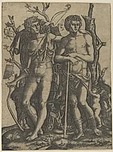 Marcantonio Raimondi (c. 1480–1534), born near Bologna, Italy, emerged as one of the Renaissance's premier engravers, revolutionizing printmaking through his mastery of reproductive techniques. He trained in the workshop of the goldsmith, painter, and niellist Francesco Francia, whose influence is evident in his early engravings, such as the goldsmith-like shading in *Pyramus and Thisbe* (1505), h...