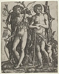 Apollo standing at the left, his hand resting on the shoulder of Hyacinthus, Cupid in the lower right