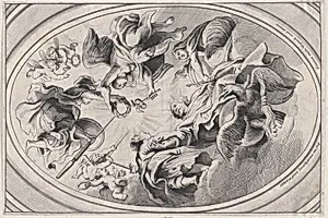 Apotheosis of James I, with the king seated at the bottom, an eagle below him, two angels holding a laurel above him, surrounded by putti