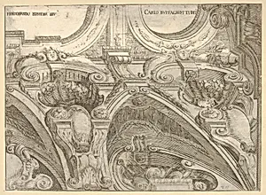 This exquisite etching captures an elaborate Baroque cornice viewed dramatically from below, showcasing the intricate scrollwork, volutes, and ornamental flourishes typical of late 17th-century architecture Created between 1680 and 1710 by Carlo Buffagnotti and Ferd Galli Bibiena—members of the renowned Bibiena family of Italian architects, painters, and stage designers—it exemplifies their mastery in rendering architectural grandeur through printmaking. The trimmed sheet measures just 7 3/16 × 9 13/16 inches, yet its upward gaze evokes the awe-inspiring scale of palatial interiors or theatric...