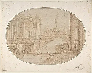 Architectural Perspective for a Stage Set with a Bridge, Statues and a Fountain in the Background and Human Figures in the Foreground