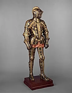 Step into the glittering world of Elizabethan England with the *Armor Garniture of George, Third Earl of Cumberland*, crafted in 1586 by master armorer Jacob Halder at the Royal Arm in Greenwich. This magnificent steel suit, weighing a formidable 60 pounds, was made for George Clifford (1558–1605), a dashing courtier, naval adventurer, and champion tilter who served Queen Elizabeth I. Greenwich armorers like Halder were at the pinnacle of European craftsmanship, blending functional protection with opulent decoration under royal patronage, symbolizing the Tudor monarch's power and the era's chi...
