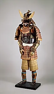This exquisite *gusoku* (full suit of armor) exemplifies the masterful craftsmanship of two renowned Japanese armor-making lineages: the Myōchin school, represented by Munesuke in the th century, and theotome school, via Ietada in the 18th century. Spanning these eras—from the turbulent Sengoku period of civil wars to the more peaceful Edo era—this composite armor reflects how samurai gear evolved from battlefield functionality to symbols of status and artistry. Standing at an imposing 67½ inches tall, it would have clad a warrior from head to toe, offering both protection and prestige. Craft...