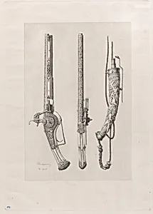**Arms of the XVIth** is a masterful etching by French artist Jules-Ferdinandemart, created in 1865. Jacquemart, renowned for his meticulous reproductions of historical artifacts, captures the intricate details of 16th firearms in this print from the second state of three, as cataloged by the scholar Gonse. Measuring 17 5/16 × 12 1/8 inches on the sheet, it showcases his skill in rendering metalwork, ornamentation, and mechanical precision with astonishing clarity. This artwork reflects a 19th-century fascination with Renaissance arms and armor, a period when European gunsmiths pioneered inno...