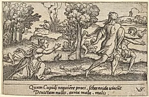 Atalanta and Hippomemes, in the foreground Atalanta kneeling to pick up an apple and Hippomemes running with an apple in either hand, in the landscape background Atalanta running, from a series of four mythological scenes