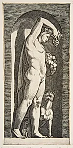 Bacchus standing in a niche holding grapes in his raised right hand, fruit in his left hand, a dog lower right