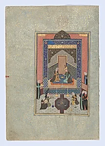 This exquisite folio, titled *"Bahram Gur in the Palace on Saturday"* (Folio 207), comes from a lavishly illustrated *Khamsa* (Quintet)—a collection of five epic poems by 12th-century Persian poet Nami of Ganja. in 1524–25 CE during the Safavid dynasty in Persia, it depicts a legendary scene from the tale of Bahram Gur, Sasanian king famed for his adventures with seven princesses. Here, in the pitch-black Saturday palace ruled by the ebony-skinned princess, Bahram listens to haunting music, surrounded by women and instruments—a clever narrative device symbolizing sensory perception and royal p...