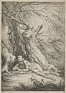 In the late 18th century, Lamar West, son of the renowned neoclassical painter Benjamin West, *Bandit Beneath a Tree (1795–1801), an evocative etching that captures a solitary armed figure resting under a sprawling tree. This print, measuring about 15¼ × 10⅞ inches, draws viewers into a moment of quiet tension, blending the rugged individualism of the bandit with the natural shelter of the tree. West, trained in his father's London studio and active in the Royal Academy circle, often explored dramatic historical and genre scenes, reflecting the era's shift toward Romantic sensibilities amid En...