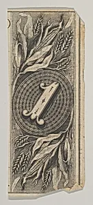 Banknote motif: the number 1 against an oval of woven lathe work, inside a rectangle decorated with grain