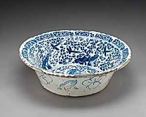This exquisite basin, crafted by Mexican potter Damián Hernández 1660 and 1680, exemplifies the vibrant tradition of tin-glazed earthenware from Puebla. Measuring 6½ inches high and an impressive 20¼ inches in diameter, this wide, shallow vessel was used for washing or as a decorative centerpiece. The tin glaze technique—introduced by Spanish artisans in the 16th century—created a smooth, opaque white surface ideal for bold polychrome decorations, often featuring lively figures of women amid floral motifs, blending European maiolica methods with indigenous Mexican aesthetics. Produced during ...