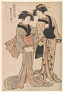 Kitao Shigemasa's *Beauties of the East* (ca. 1782) is a captivating woodblock print from Japan's Edo period (1615–1868), showcasing the artist's mastery in *bijin-ga*, or images of beautiful women. This vibrant ink and color on paper work, measuring 14 11/16 x 10 inches, depicts elegant female figures embodying the refined aesthetics of urban life in 18th-century Japan. Shigemasa, a leading ukiyo-e ("pictures of the floating world") artist, was renowned for his delicate portrayals of courtesans and everyday beauties, blending realism with idealized grace. Woodblock printing, the medium's hal...