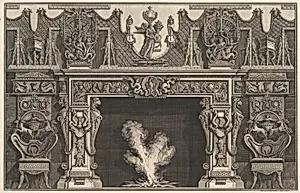Bird in shell at the center of the lintel, with a frieze of trophies, surmounted by an overmantel with candelabra and flanked by chairs. (Ch. décorée d'une frise de casques et d'armures . . .)