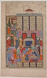 Welcome to the Islamic Art galleries at the Metropolitan Museum of Art where this exquisite folio from a *Shahnama* (Book of Kings) transports visitors to the world of Persian epic poetry. Titled "Birth of Rust," this 16th-century illumination (ca. 1560–80) captures a pivotal moment from Abu'l Qasim Firda's monumental 10th-century masterpiece. Rustam, the legendary hero of ancient Iran, is born to Rudabeh in a dramatic scene filled with attendants—men and women surrounding the infant, symbolizing joy, wonder, and the dawn of a mythic champion whose exploits shaped Persian identity for centurie...