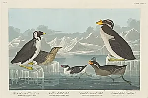 Black-throated Guillemot, Nobbed-billed Auk, Curled-Crested Auk and Horned-billed Guillemot
