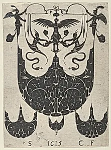 Blackwork Print with a Bezel Supporting Grotesques Above Three Smaller Bezels, from a Series of Blackwork Prints for Goldsmiths' Work