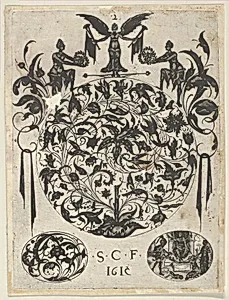 Blackwork Print with a Roundel with Tendrils and Birds Above Two Ovals, from a Series of Blackwork Prints for Goldsmiths' Work