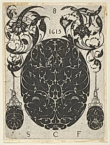 Blackwork Print with an Oval at Center Flanked by Pendants Hanging from Foliate Scrolls, from a Series of Blackwork Prints for Goldsmiths' Work