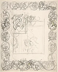 Border design with knights, ladies and dragons (recto); Sketches for border elements (verso)