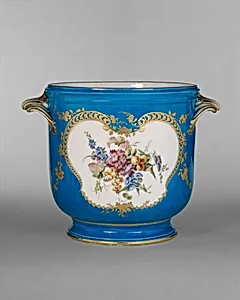 This exquisite bottle cooler, or *seau à bouteille*, hails from the prestigious Louis XV service crafted by the Vincennes Manactory in 1754, during the opulent reign of King Louis XV. at the royal porcelain factory near Paris, it exemplifies the height of French Rococo luxury, designed to gracefully cradle and chill wine bottles at aristocratic banquets. Jean-Claude Duplessis, master modeler, likely contributed to its sculptural form, blending functionality with lavish ornamentation adorned with vibrant fruits and flowers in the tags. Crafted from soft-paste porcelain—a delicate, translucent ...