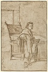 Boy Holding a Sword, Standing near a Table in an Interior; verso: Various Sketches of Figures and Ornamental Forms