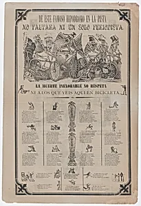 This striking broadsheet from around 1895–1900, created by the renowned Mexican printmaker José Guadalupe Posada collaboration with publisher Antonio Van Arroyo, captures the macabre wit of Mexico's popular print tradition. On the recto, skeletons pedal furiously on bicycles at a racetrack, mocking journalists with the caption: "From this famous hippodrome Death is inexorable and doesn't respect those that you see on bicycles." The verso bony figures buying and selling printed images, sly nod to the print trade itself. Measuring 23⅝ × 15¾ inches, it's a masterful example of affordable, mass-produced ephemera meant for everyday audiences.