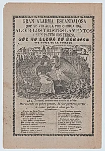 Broadsheet with a ballad addressing poverty, woman sitting in a field of flowers with a duck that has a human's head by José Guadalupe Posada