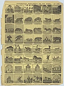 Broadside with 48 scenes depicting animals from Mr Bidel's zoo in Barcelona