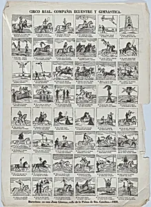 Broadside with 48 scenes depicting the equestrian and gymnastic moves of the royal circus by Juan Llorens